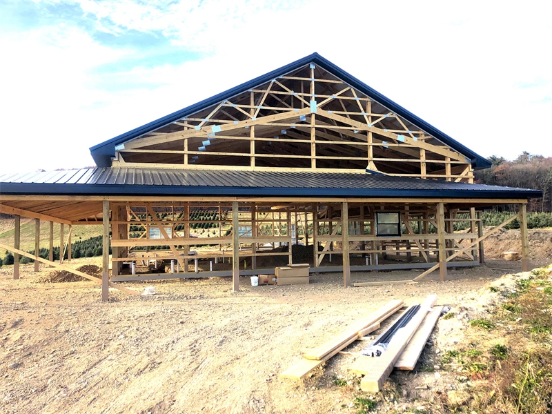 Agritainment building with wrap around open framed porches. The building is used for various public functions that deal with the multiple festivals that take place at Yenser's Tree Farm throughout the year. A large banquet room that can be used for weddings, birthday parties, and other special events. A full commercial kitchen in the building that is able to serve the needs of the multiple functions that take place at the building. The custom timber railings and entryways are made from locally sourced lumber.