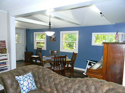 In the dining room area, the old dark wooden ceilings were removed and replaced with sheetrock and white paint giving a much more open, larger and inviting feel to the dining area.